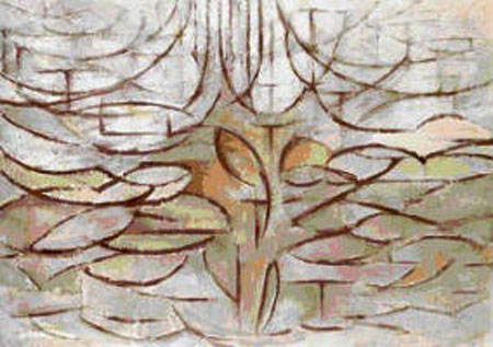 Un altro olio su tela 78 x 107, l’albero argentato del 1911, rappresenta ancora di più il processo di astrazione: il soggetto è ancora riconoscibile, ma i rami, che si fanno largo attraverso un colore denso e pastoso, sono sempre di più riprodotti a linee semplici più o meno spesse, il senso di profondità si annulla così come il cromatismo.