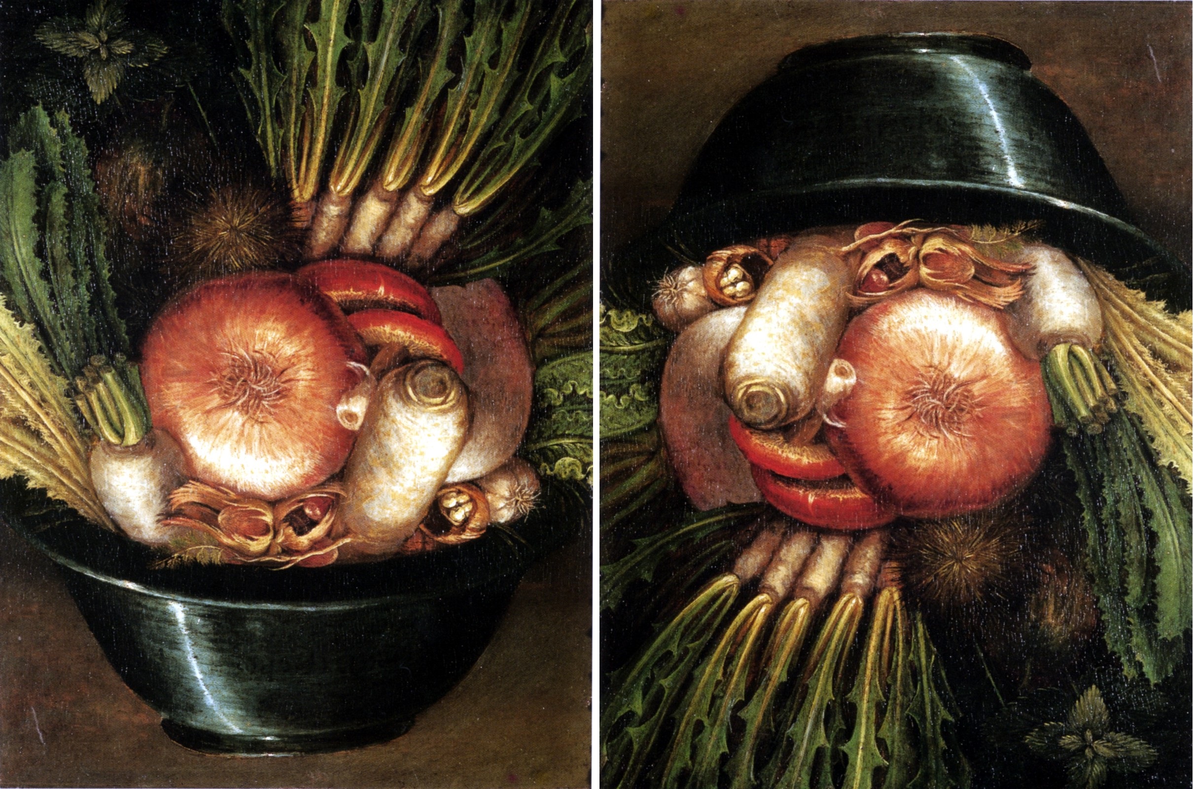 Altro esempio di figura ambigua è l’opera di Giuseppe Arcimboldo, intitolata l’ Ortolano, questa volta siamo indietro nel tempo, 1590 circa: il cesto di verdura raffigurato nel dipinto, se capovolto, può essere interpretato e visto come un volto umano .. .. .. semplicemente stupefacente.