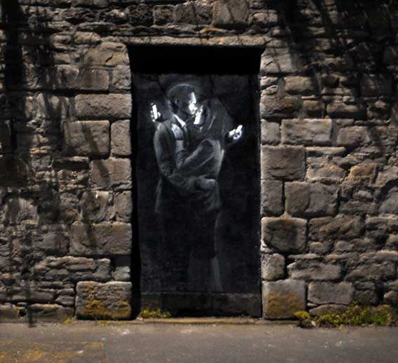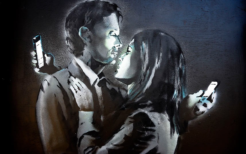 Arriviamo ai nostri giorni all’amore ai tempi dello smartphone. Banksy, nella sua opera “Mobile lovers”, sostituisce il bacio con un abbraccio sparisce l’intenzione del bacio, quasi accennata resta solo un flebile abbraccio con lo sguardo puntato al telefonino, collocato dietro le spalle delle figure. Un’immagine forte, anche se appena accennata, in ombra, scura, che interpreta la freddezza dei rapporti, l’indifferenza, la superficialità. Un’opera che nasconde molto più di quello che sembra, amanti ma solo di nome, amanti senza amore, senza passione… lontani seppur così vicini.